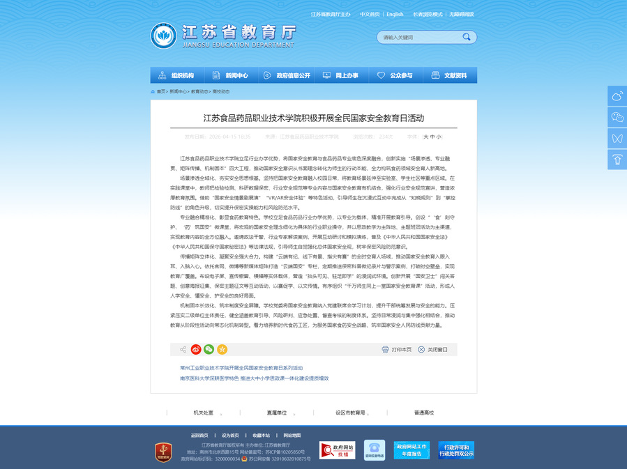 江苏食品药品职业技术学院立足行业办学优势,将国家安全教育与食品药品专业底色深度融合,创新实施“场景渗透、专业融贯、矩阵传播、机制固本”四大工程,推动国家安全意识从书面理念转化为师生的行动本能,全力构筑食药领域安全育人新高地。